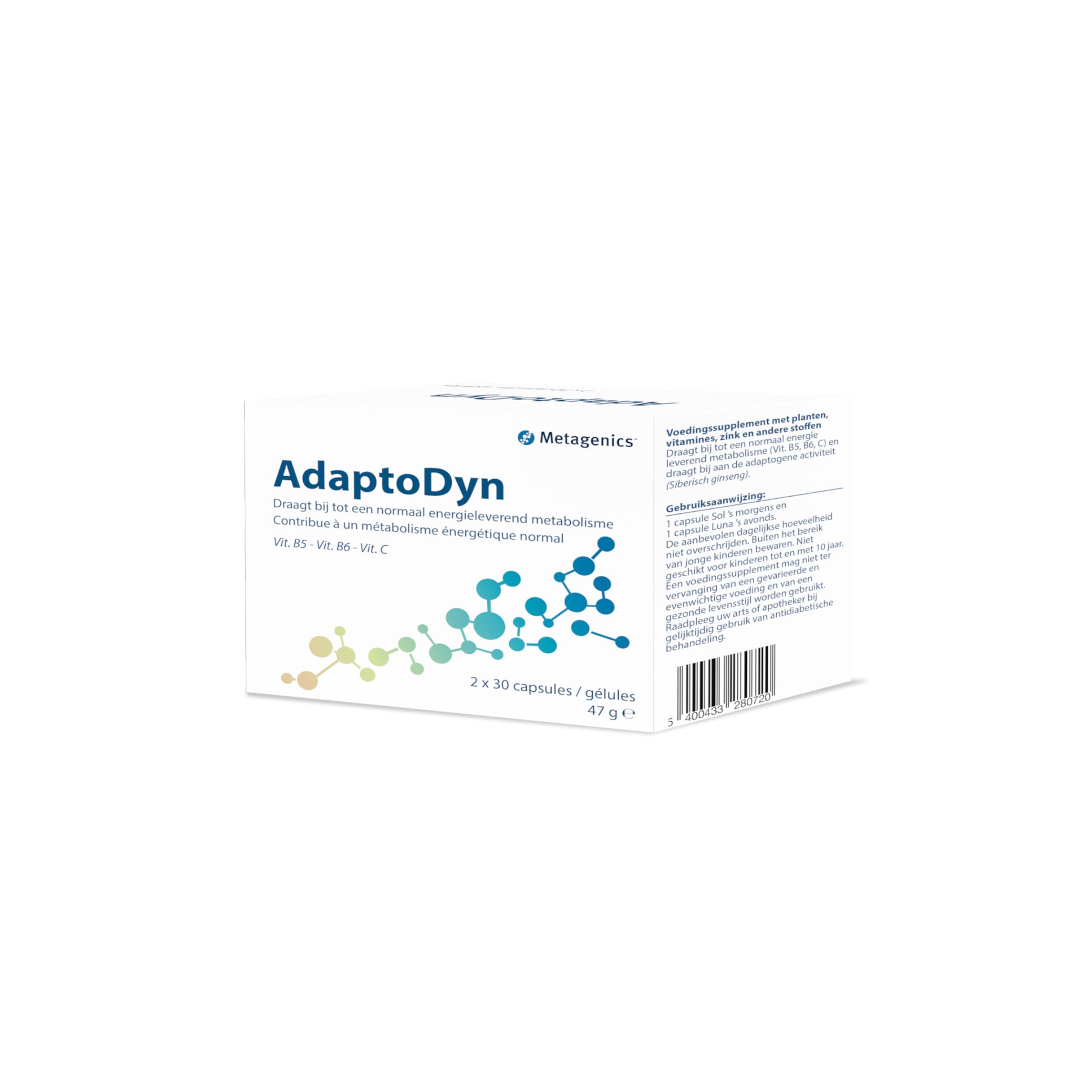 AdaptoDyn contient les vitamines B5, B6 et C pour soutenir le taux d’énergie et le ginseng sibérien pour l’effet adaptogène.