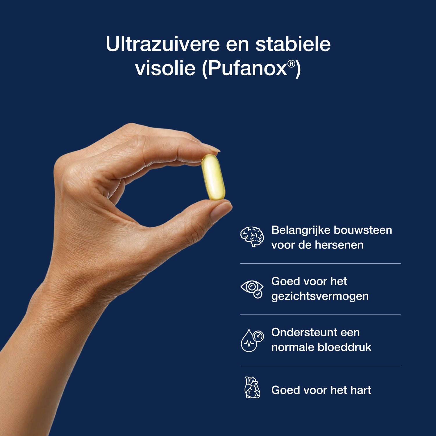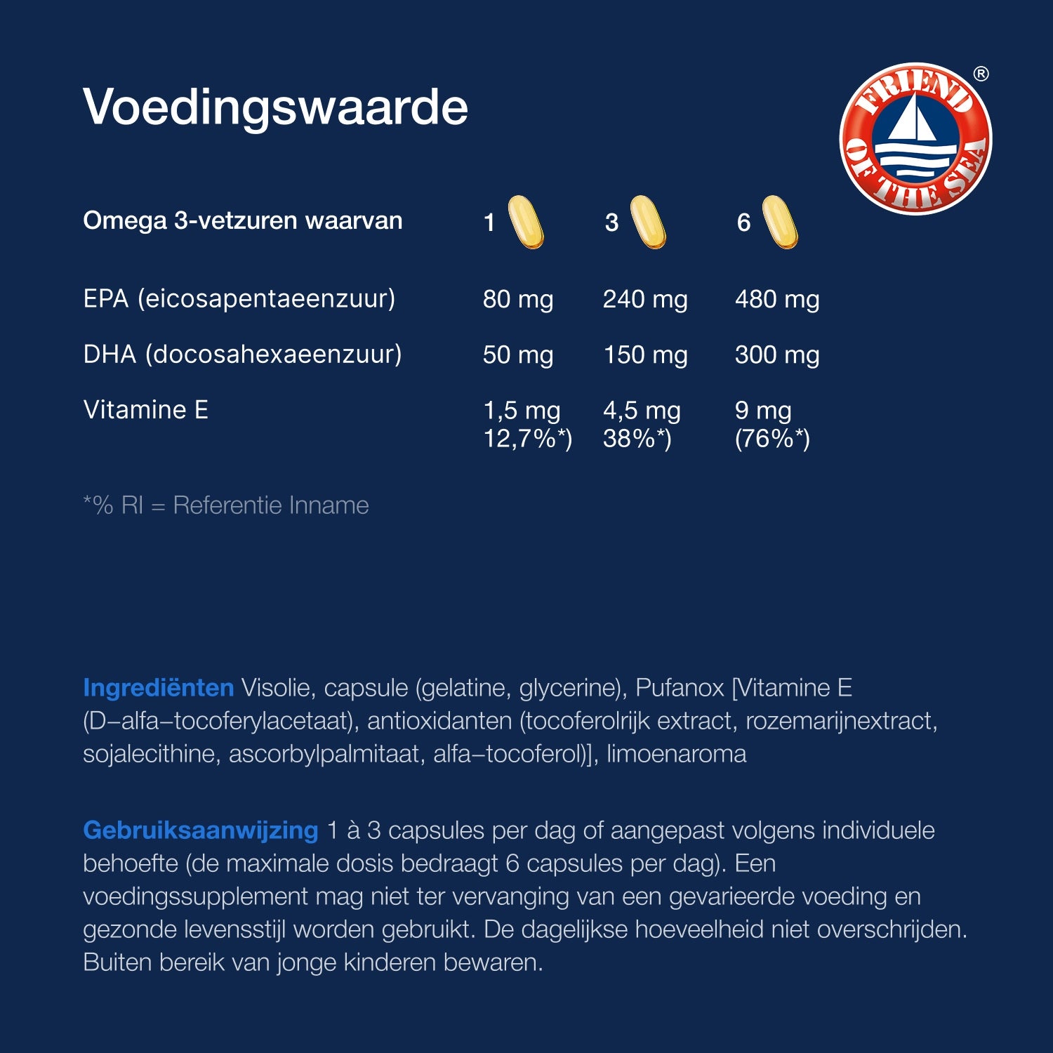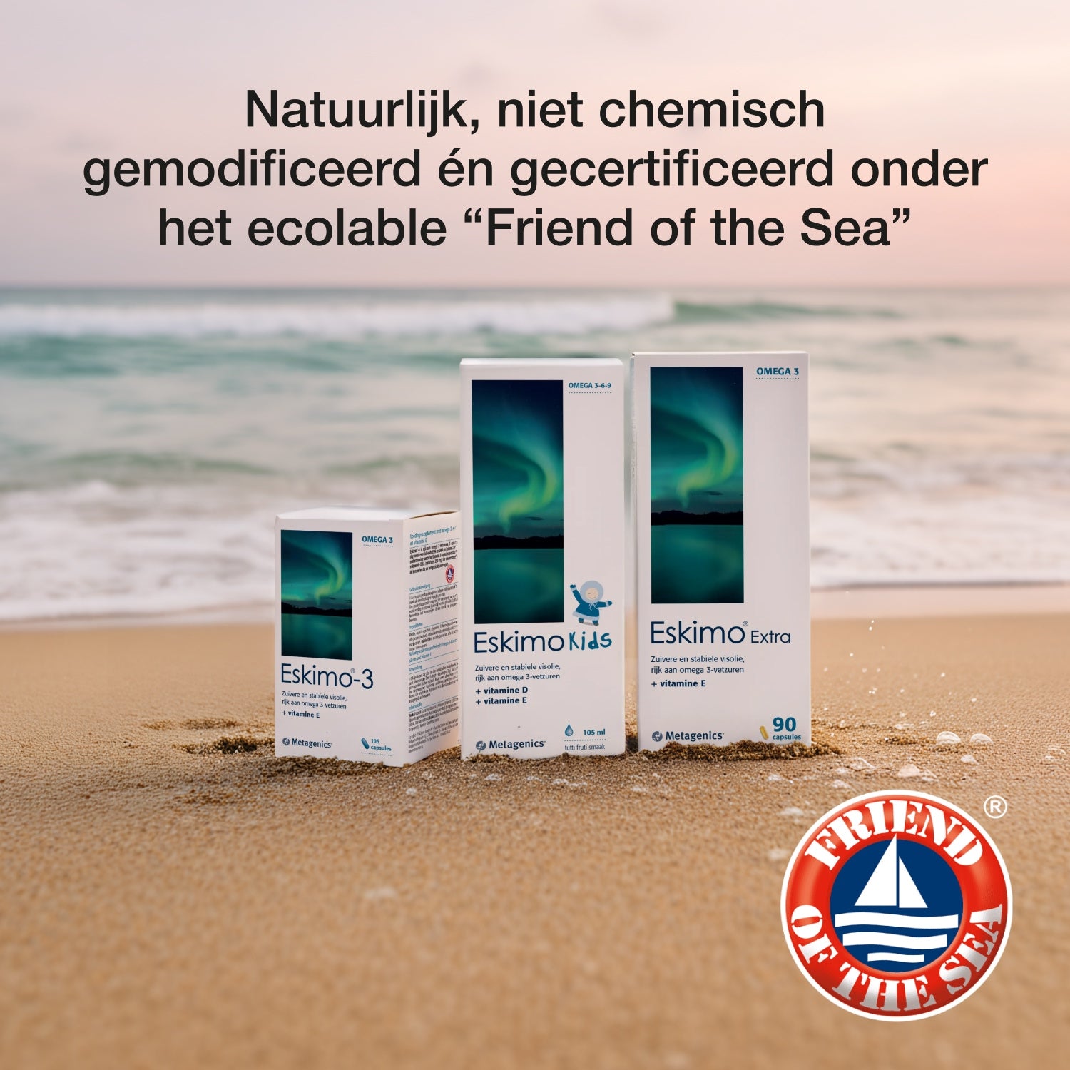Eskimo®-3 est riche en acides gras oméga-3. 3 gélules par jour contiennent assez d’EPA et de DHA (au moins 250 mg) pour soutenir la fonction cardiaque. 5 gélules par jour fournissent assez de DHA (au moins 250 mg) pour soutenir un fonctionnement normal du cerveau et une vision normale.
