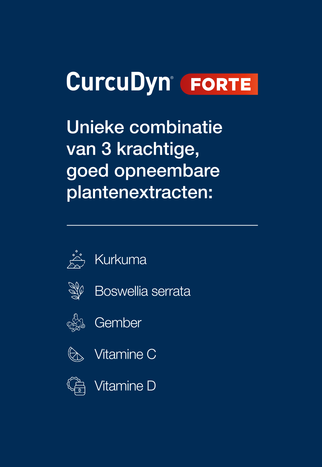 CurcuDyn® Forte bevat boswellia- en gemberextracten die bijdragen tot het behoud van soepele gewrichten. CurcuDyn® Forte bevat ook vitamine D die bijdraagt tot de normale werking van de spieren, en vitamine C die bijdraagt tot de normale collageenvorming voor de normale werking van het kraakbeen.